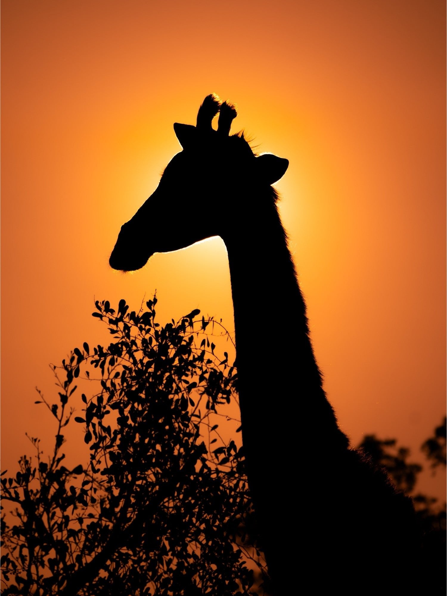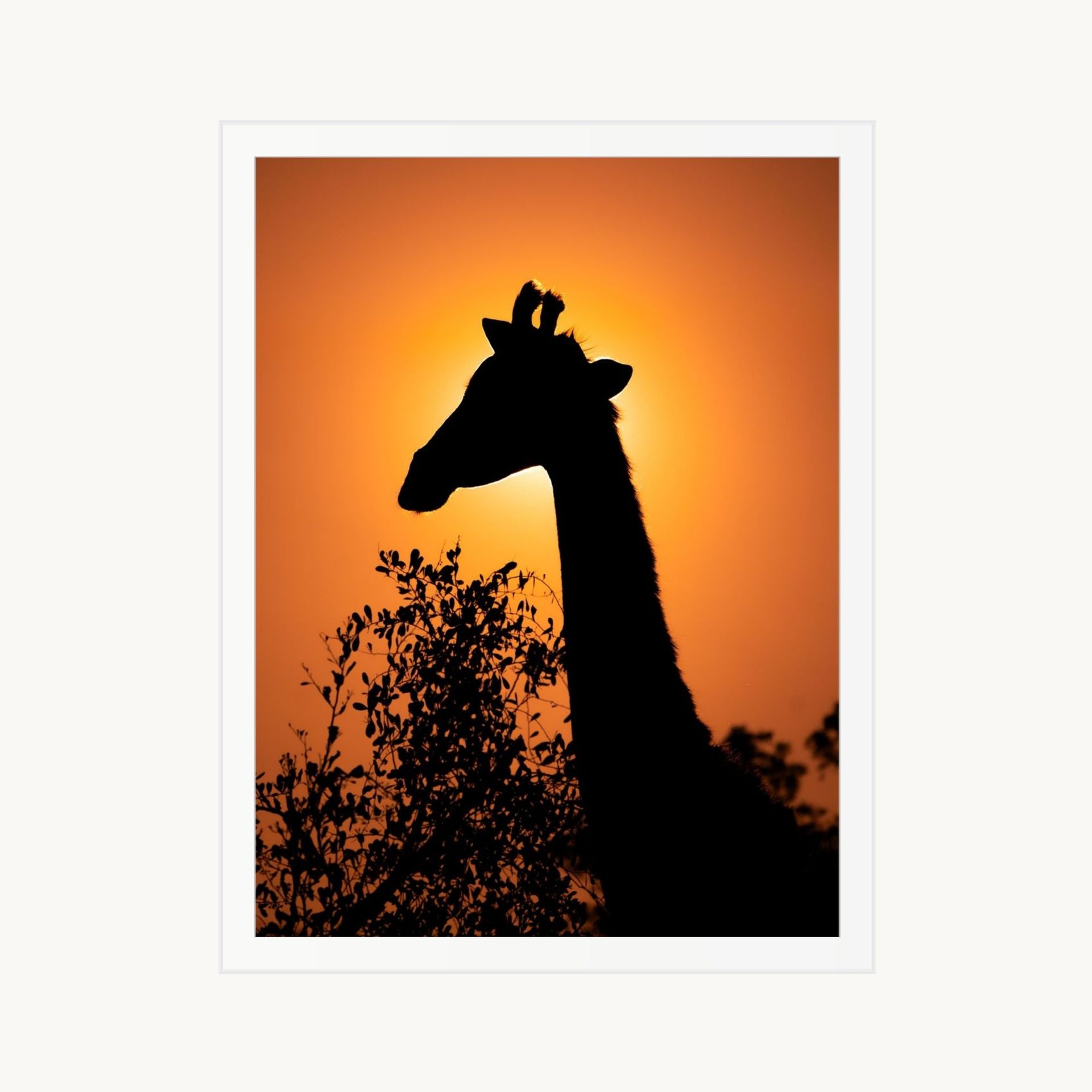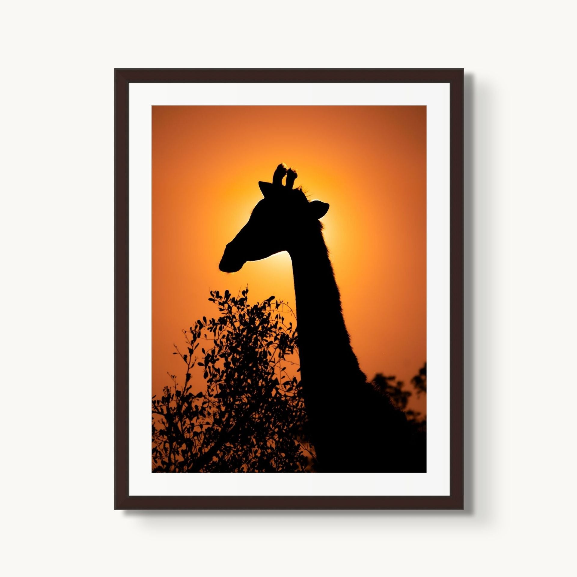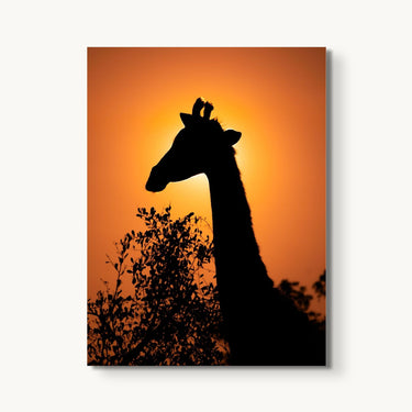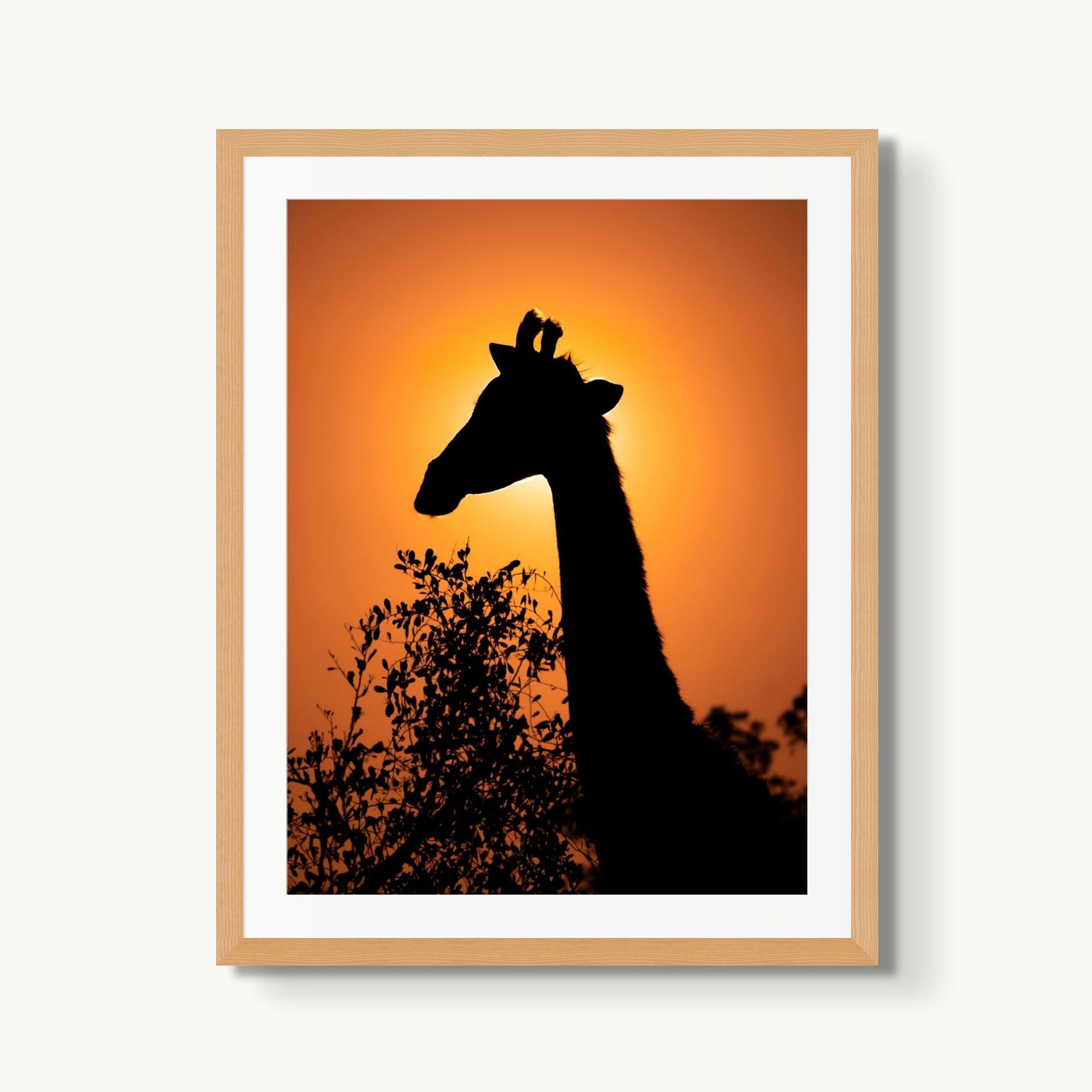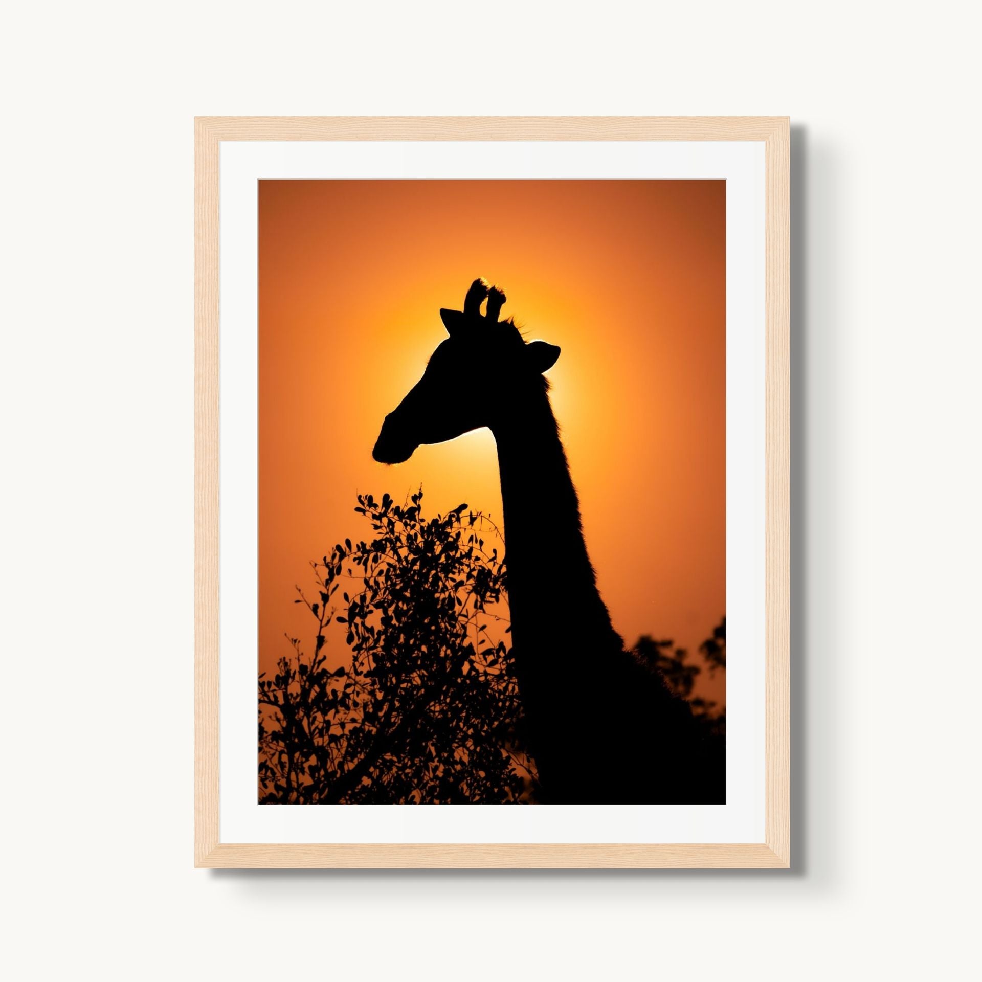 As the sun drops over Sabi Sands, a lone giraffe steps into the glow — 'Giraffe Ecplipse' brings the warmth & wonder of an African sunset (and one it's most elegant creatures) straight into your space.